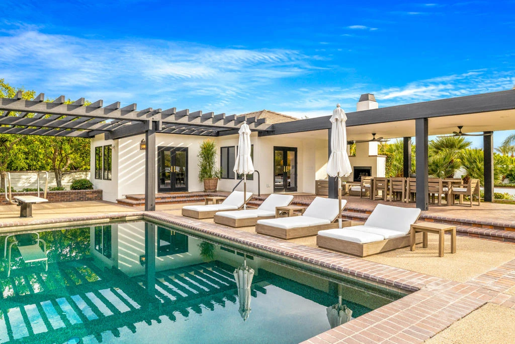 The Modern Ranch Estate awaits your next desert getaway. Walkthrough the front door and take in the bright natural light, show-stopping decor, tons of natural wood, and organic surfaces. This newly remodeled masterpiece features a spacious formal living area that includes just one of many fire features, a state-of-the-art kitchen, four highly appointed bedrooms in the main house, and one detached casita with a full kitchen. Totaling aprox. 8,000 sqft and 6 ensuite bedrooms. The expansive outdoor living area features tremendous grounds that blend together with an outdoor fireplace and dining area that is situated next to a relaxing pool & spa. All the amenities you need and more - pool table, billiard room with bar, state-of-the-art golf simulator, full-size gym, outdoor putting green, tennis court, full-size basketball court, and outdoor shower/pool room. The Modern Ranch Estate was designed by local designer Hagit Taylor and featured in an article by Southern California based interior-designer Becki Owens. This meticulously curated home was also showcased on Ashley Stark's Instagram, Creative Director at STARK.