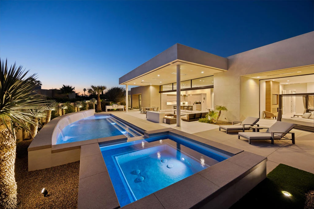 Welcome to this cutting-edge desert contemporary masterpiece, a fully furnished 4-bedroom, 6-bathroom estate offering 5,048 sq ft of refined luxury and sophisticated design. Situated on a premium cul-de-sac lot with highly sought-after southwest exposure, this residence captures breathtaking, panoramic mountain range views and delivers resort-style living at its finest.From the moment you enter through the dramatic pivot front door, you're greeted by 14-foot ceilings, a custom 9-foot fireplace, and motorized pocket sliding doors that seamlessly blend indoor and outdoor living in the expansive great room. A step-down bar and a stunning glass-enclosed wine room add flair to your entertaining space, while the adjoining dining area features manual pocket sliders for effortless flow.The chef's kitchen is outfitted with top-of-the-line Wolf and Sub-Zero appliances, a substantial walk-in pantry with built-in cabinetry, a full-size refrigerator, and an integrated coffee station--perfect for hosting or daily luxury.Each of the four en-suite bedrooms, including a private office, features direct access to the exterior, offering serene transitions to the landscaped surroundings. The primary suite is a true retreat with a spa-like bath, dual water closets, and sliding doors that lead to a secluded outdoor tranquility garden.Outdoors, the resort-style amenities continue with a custom pool and spa, a full outdoor entertainment center with pop-up TV, fire ledge, recessed electric heaters, and a mist system for year-round comfort. A covered structural patio overhang and 36x36 tile flooring that flows from the interior to the exterior enhance the seamless, modern design.Additional features include a private, gated, motor courtyard, four-car garage (~1,165 sq ft) with two AC units, Sonos sound system throughout the home including interior and exterior and custom lighting and premium finishes throughoutThis home redefines high-end desert living--resort never looked so good.