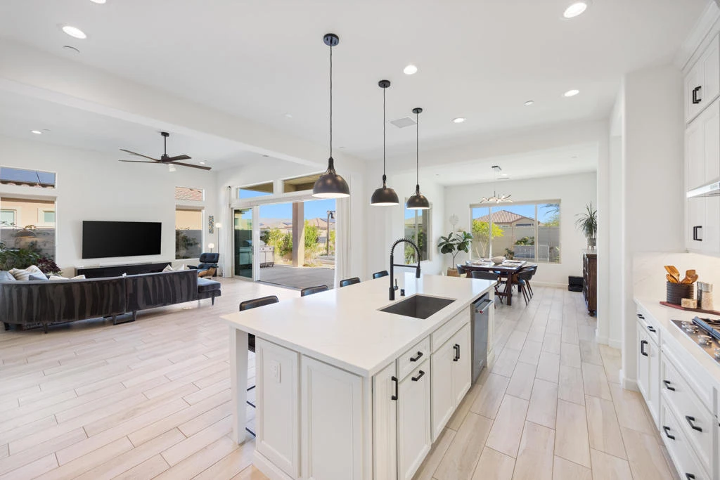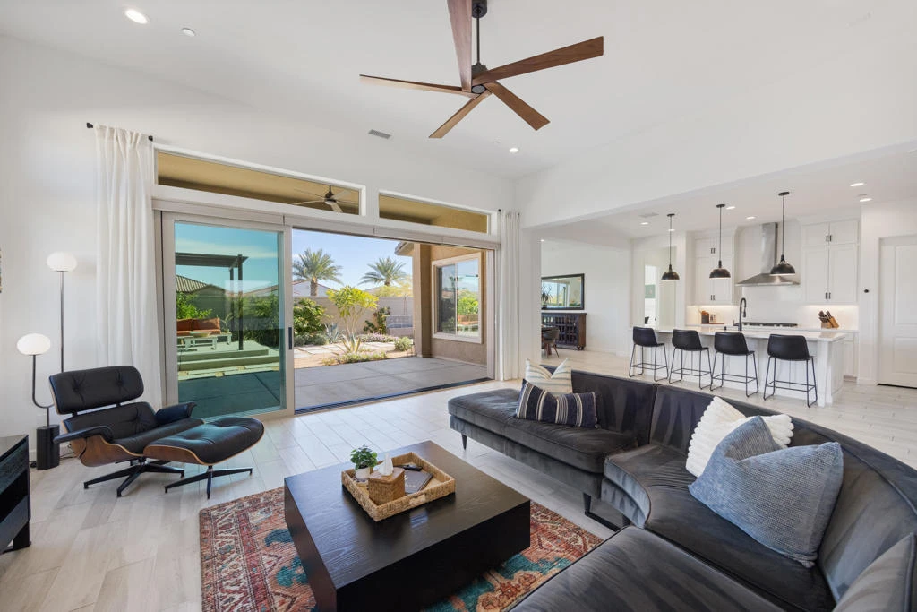 Experience turnkey desert living in this upgraded Serenity floor-plan home in a premier 55+ gated community. Bright, open-concept design with tile flooring throughout, custom window coverings, upgraded lighting, and a chef's kitchen featuring quartz counters, full backsplash, large island, and walk-in pantry. Multi-slide glass doors open to an extended covered patio and low-maintenance backyard with mountain views ideal for indoor-outdoor living and entertaining.The private primary suite offers patio access, dual quartz vanities, walk-in shower, and large closet. Two guest bedrooms plus a flexible den provide space for visitors or a home office. Owned solar, insulated 2.5-car garage with A/C, and upgraded laundry room add comfort and efficiency.Resort-style amenities include a clubhouse, pool/spa, fitness center, pickleball, tennis, bocce, and a full social calendar. HOA includes internet, cable, and streaming. Move-in ready!