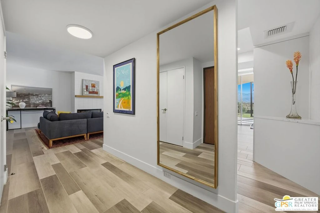 Back On Market! Buyer failed to perform. Seller Motivated. This exquisitely remodeled residence showcases breathtaking southern views of the Santa Rosa Mountains, shimmering lake, and lush golf course visible from nearly every room. Step onto your expansive 500 sq. ft. covered terrace, the perfect setting to unwind, entertain, and embrace the quintessential indoor-outdoor desert lifestyle. A formal entry welcomes you into a bright and spacious living room featuring wood-look ceramic tile floors, a cozy gas fireplace, and dramatic 9-foot walls of glass that open seamlessly to the terrace. The modern chef's kitchen impresses with sleek quartz countertops, custom cabinetry, and stainless-steel appliances all in a serene, neutral palette. Both bathrooms have been beautifully updated with quartz vanities, designer tile, and contemporary fixtures, adding to the home's refined appeal. Set within the exclusive Desert Island community a gated, mid-rise enclave surrounded by a sparkling lake and an impressive 18-hole golf course residents enjoy resort-style amenities including scenic walking paths, tennis and pickleball courts, heated pools and spas, and 24-hour guard-gated security. HOA dues conveniently cover cable TV with HBO/Showtime, high-speed Wi-Fi, water, gas, trash, and more. Ideally situated in the heart of Rancho Mirage, just moments from Eisenhower Health, Sunnylands, and world-class shopping and dining, this sophisticated home offers the perfect blend of comfort, style, and convenience. Some furnishings may be available per seller inventory.
