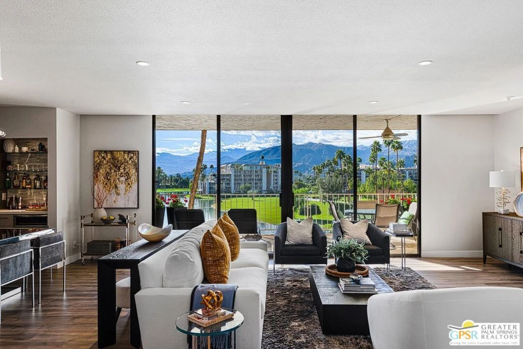 Beautifully renovated and impeccably styled, this residence at 910 Island Drive, Unit 410 offers quintessential Desert Island living with panoramic lake, golf course, and mountain views. Located within the prestigious 24-hour guard-gated Desert Island community in Rancho Mirage, this upper-level home blends modern design with resort-style comfort. A dramatic double-door entry opens to a light-filled interior featuring warm wood-tone flooring, recessed lighting, and a spacious open layout ideal for entertaining. The living room is anchored by a sleek stacked-stone fireplace and flows seamlessly into the dining area with a custom built-in bar perfect for hosting guests. Floor-to-ceiling glass frames tranquil water views and opens to a generous covered balcony, ideal for outdoor dining, relaxing, and enjoying desert sunsets over the lake and fairway. The remodeled kitchen showcases contemporary flat-panel cabinetry, quartz countertops, stainless steel appliances, designer tile backsplash, and a large peninsula with seating. The expansive primary suite offers stunning views, a sitting area, ceiling fan, and multiple closets, including a walk-in. The spa-like primary bath features a dual-sink vanity, modern lighting, a soaking tub, and a large walk-in shower with designer tile and rain shower head. A well-appointed guest bedroom and updated guest bath provide comfort and privacy for visitors. Additional features include a formal foyer, in-unit laundry room, tasteful finishes throughout, and a thoughtful floor plan that feels both open and refined. Desert Island amenities include lakes, lush landscaping, multiple pools and spas, fitness center, tennis and pickleball courts, clubhouse, and on-site management just minutes from shopping, dining, and Eisenhower Medical Center.