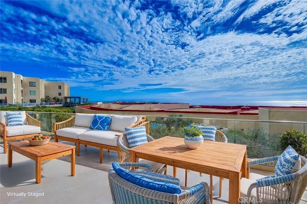 Welcome to Paradise in this Ocean Front one Level End Unit! 2 bedroom 2 bathroom condo w/stunning Pacific Ocean, Catalina Island, Golf Course & Hillside views awaits you! Massive outdoor patio boasts modern glass railings & striking panoramic ocean views giving you the best coastal experience! Outdoor deck is a rarity & is perfect for lounging, BBQing, entertaining, watching the ships sail by, staring at the stunning sunsets & star gazing. Enormous open concept living room boasts cozy gas fireplace, closet & outdoor deck access via sliding glass doors. Dining area attached to living room showcases amazing ocean views, plantation shutters, fresh paint & ceiling fan. Open concept chef's kitchen boasts stunning ocean views, recessed lights, tile backsplash, gorgeous, blue-toned cabinetry, stainless steel utility sink, stainless steel fridge, electric cooktop, double oven, dishwasher, recessed lights, walk-in pantry & lots of countertop space. Large primary bedroom features easy care laminate floors, huge walk-in closet, plantation shutters & bathroom ensuite. Primary bathroom offers 2 vanities/sink areas, walk-in shower & blue-toned cabinets. Guest bedroom has wall-to-wall closet space, sliding mirrored doors, lots of shelving & can be used as an office, 2nd bedroom or private home gym. Guest bathroom boasts blue-toned cabinets, single sink vanity & tub/shower combo. Laundry closet in home is convenient & comes with washer & dryer! Home features lots of storage spaces including coat closet, shelved utility closet, shelved panty & huge private storage (10ft x 6ft) in garage. 2 large private parking spots located next to each other in garage come w/home. Unit near elevators for convenience! Ocean Terrace offers majestic ocean views, picturesque scenery & is pet friendly! HOA Allows rentals! Amenities include poolside lounge, in-ground pool & hot tub w/striking ocean views, tennis courts, vegetable gardens, shuffleboard, pickleball, gym, dog park, rec center w/kitchen, billiards & sauna, EV charging stations & guest parking. Condo located on a quiet cul de sac near golf courses & hiking trails that span down the coast featuring private beaches & magical ocean coves. Home located in an awarding-winning school district, overlooking golf course & nearby Terranea Resort, parks, dining & freeways! Make this your forever getaway!