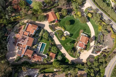 Nestled in a peaceful, private setting, this timeless residence has been thoughtfully renewed to suit contemporary family living. The gracious layout features a serene primary sanctuary, a dedicated family wing with five en-suite bedrooms, and a spacious game room enhanced by a cozy fireplace and adjoining catering kitchen. Numerous French doors create effortless flow from the main living spaces to the inviting outdoor areas. The level, fully usable 4.19 acres include a 1,081 sq. ft. two-bedroom, two-bath guest house, tennis court, gated pool, citrus and fruit orchard, and expansive lawns. This classic Covenant property sits on meticulously maintained grounds with a built-in barbecue, fireside gathering spot, and vibrant flowering gardens. Inside, the refined primary suite has been transformed into a luxurious haven featuring premium finishes, custom millwork, and marble accents. The warm, welcoming kitchen is equipped with top-tier amenities complemented by Calcutta marble countertops and custom refinished cabinetry. Formal living and dining rooms highlight exceptional craftsmanship, including detailed beamed ceilings, abundant built-in cabinetry, and an impressive carved limestone fireplace. A sunroom just off the living room provides yet another inviting space to enjoy the surrounding scenery. The charming guest cottage—complete with kitchenette, living area, and laundry—boasts plentiful windows that flood the space with natural light and frame views of the beautiful grounds. Main residence: 7,592 sq. ft. | Guest house: 1,081 sq. ft. | Garage: 950 sq. ft.