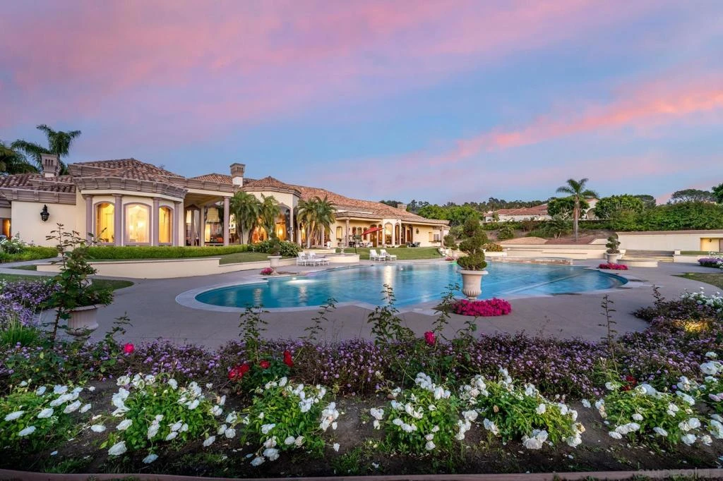 An extravagant European estate in one of Rancho Santa Fe’s premier neighbors of Del Rayo Downs. This single-story masterpiece, just a 10-minute drive from the serene coastline, offers some of the finest panoramic views in Rancho Santa Fe. Upon entering, the home's beauty captivates you. A grand foyer with an Austrian crystal chandelier sets the stage for the elegance that follows. The view-inspiring living and dining rooms feature custom wainscoting and ceiling details, blending artistic elegance with comfort. Meticulous attention to detail is evident throughout, from the stained glass dome to hand-painted murals. The coffered vaulted ceilings and intricately carved corbels showcase the home's craftsmanship, with laser-cut slab marble. The primary suite is a stunning retreat with spa-like baths and his-and-her walk-in closets. Across the hall are three additional bedroom suites. The nearby grand office features fine wood paneling, detailed ceilings, and an oversized fireplace. The gourmet kitchen boasts slab granite counters, custom cabinetry, and commercial-grade appliances, opening to both the breakfast nook and the spacious family room. Adjacent to the family room is a state-of-the-art media room, perfect for viewing and at-home performances. This end of the home also includes two guest bedrooms, an attached 4-car garage, and a detached 4-car garage for up to 8 vehicles. This estate offers elegance, comfort, and beauty, creating a haven to cherish for years to come.