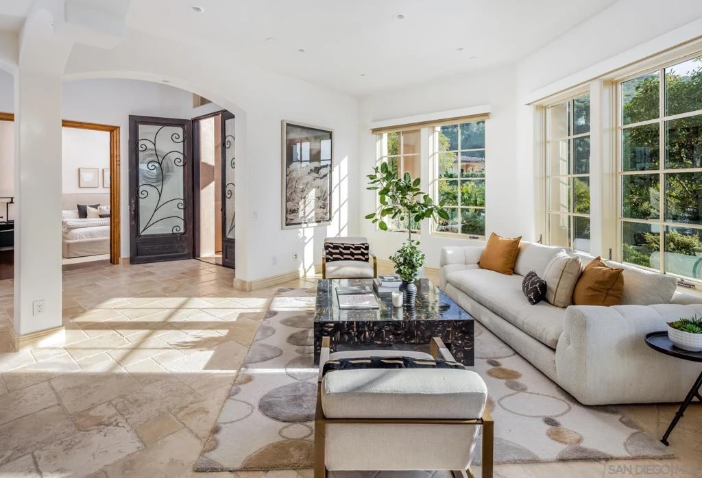 Single-level luxury with sweeping Rancho Santa Fe and peek ocean views, set behind the guarded gates of Cielo. This single-level 5-bedroom, 4.5-bath estate offers northwest views, privacy, and refined indoor-outdoor living on a generous lot within the Rancho Santa Fe community. Soaring 17 to 20-foot ceilings define the main living areas, while four bedrooms feature en-suite baths for elevated comfort. The fifth bedroom, currently configured as an office and complete with a closet and murphy bed, can serve as an additional bedroom. The oversized primary suite boasts its own fireplace, outdoor access, and sweeping views, along with a spa-caliber bath complete with a soaking tub, dual-head shower, and expansive walk-in closet. The chef’s kitchen is equipped with Wolf range, large pantry, and secondary prep area. Outdoors, a covered entertaining pavilion overlooks the resort-style pool and spa, surrounded by low-maintenance landscaping and endless views. Additional highlights include 11kw owned solar with critical load battery backup system, EV charger, tankless water heater, and three-car garage with epoxy floors. Residents enjoy access to Cielo’s private clubhouse and resort-style amenities, all within the top-rated Rancho Santa Fe School District.