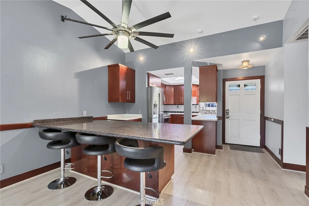 Welcome to 42 Abrigo in Rancho Santa Margarita, located in the desirable Los Portillos community. This beautifully upgraded upper-level 2 bedroom, 2 bathroom residence offers comfort, style, and a highly sought-after location. The home showcases gorgeous upgrades throughout, creating a move-in-ready space with a warm and inviting feel. The thoughtfully expanded chef’s kitchen is a standout feature, designed for both functionality and entertaining. It features rich cherry cabinetry with soft-close drawers and doors, quartz countertops, and a large peninsula island that provides generous workspace, storage, and seating. The kitchen flows seamlessly into the dining and living areas, enhancing the home’s open and practical layout. The primary bedroom offers a private en-suite bathroom, ample closet space, and new mirrored wardrobe doors that add both elegance and functionality while enhancing the sense of space and light. The primary bath also features new mirrored wardrobe doors for a cohesive and updated look. The secondary bedroom is ideal for guests, a home office, or flexible living needs. The exquisitely fully remodeled second bathroom is a true showpiece, featuring a beautifully designed walk-in shower with high-end finishes, modern fixtures, and elegant detailing that elevate the space with both style and sophistication. The home is finished with a combination of laminate and carpet flooring and includes a newer A/C, furnace, tankless water heater, and water softener for year-round comfort. The community was recently repiped, providing added peace of mind. Additional highlights include a 1-car detached garage with abundant overhead storage and 1 carport, providing excellent parking and extra space for organization. Enjoy the privacy of an upper-level unit, just steps from the Arroyo hiking trail, with easy access to shopping, dining, parks, and award-winning schools. An excellent opportunity to own a beautifully upgraded home in the heart of Rancho Santa Margarita’s Los Portillos community.