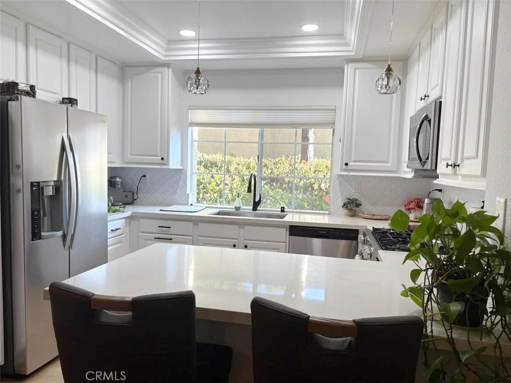 Modern ground-level 2 bedroom, 2 bathroom end unit located in the highly desirable Tijeras Creek Village of Rancho Santa Margarita. New stainless steel kitchen appliances, Quartz counters, remodeled bathrooms, and custom black hardware throughout are just a few of the amazing upgrades showcased in the home. Front entry leads you to arched walkways, designer flooring, crown molding, and custom paint throughout. Sun-soaked, the living room offers great space for entertaining and a patio door opening to the expansive wraparound patio. With ample room to add outdoor furniture and a BBQ, you can create an awesome exterior living space. Warm up next to the newly tiled fireplace or turn on the central HVAC during the summer. The open concept kitchen oversees the adjoining dining area and living room, complete with a coffee bar on the peninsula brightened by pendant lighting. Appliances include a 5-burner gas range/oven, microwave, refrigerator, and dishwasher. The split bedroom floorplan adds great privacy. Roomy with 3 closets, the master suite features a secondary patio door and gorgeous en suite. A walk-in shower with a step, custom frameless glass shower doors, dual vanity, and toilet privacy door are presented in the en suite. The guest bedroom, full bathroom, and stackable washer/dryer closet are nestled in the hall. An additional private balcony and direct access to the hallway bath are boasted in the ample sized guest bedroom. Newly added recessed lighting, dual pane windows, and baseboards are also included in the home. Gorgeously maintained, the HOA grounds consists of lush greenery/trees with amenities such as 2 sparkling pools, 2 spas, BBQ grills, a tot-lot, gym, and paid trash/sewer. This unit also includes 1 carport parking space, a 1 car garage. Located near Tijeras Creek Golf Club, Arroyo Vista Park, Rancho Santa Margarita Skate Park, and lots of shopping and entertainment centers! Within walking distance of Arroyo Vista Elementary School (K-8).