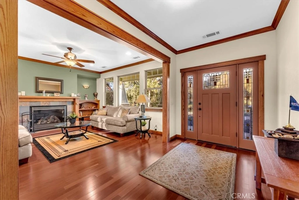 Tucked away in the rolling hills, this spacious Craftsman-style house offers privacy and charm in equal measure. At 2,675 square feet, the home features 4 bedrooms and 2 bathrooms, with wide hallways and thoughtful design details throughout. Brazilian cherrywood and Tezzano tile floors create a warm, elegant tone, while crown molding adds a classic finish. The expansive living room centers around a gas fireplace framed by built-in bookshelves and large windows that bring the outdoors in. A separate family room features another fireplace and views of the patio and in-ground Doughboy pool; perfect for relaxing or entertaining. Love to cook? You'll appreciate the kitchen's stainless steel appliances, including a Bertazzoni five-burner range, abundant cabinet space, and a custom soffit with crown molding. A built-in china hutch in the dining room provides both storage and a touch of tradition for those festive family meals. The large primary bedroom includes not one, but two, walk-in closets, plus a spacious in-suite bathroom with dual sinks placed thoughtfully apart, a jetted tub, and a corner shower. A private door leads directly to the patio; ideal for late-night stargazing or early-morning coffee. Function meets lifestyle in the sizeable laundry room with ample storage, a folding counter, and hanging rod. The three-car garage handles parking and storage with ease, and a prepped pad awaits your future shop or outdoor project. Nearby amenities include parks, schools, a grocery store, and gas stations-all within a short drive. This home blends comfort, style, and convenience in a serene setting.