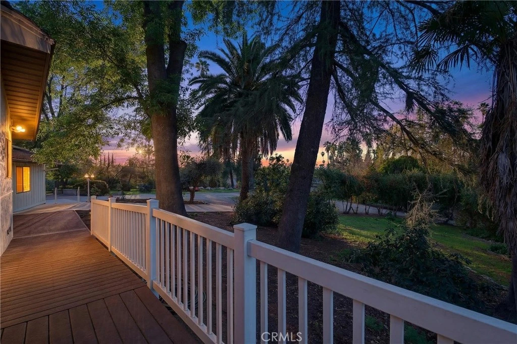 A single-story ranch-style estate nestled on 1.4 acres of sprawling gardenscape—your own private park in South Redlands. Enjoy stunning sunset and mountain views with a direct sightline to the Redlands “R.” A private road leads to a gated circular driveway that, along with two garages and an RV space, significantly expands parking. The house has been newly painted! Inside, find warm wood tones and spacious living areas that flow seamlessly. The kitchen is equipped with ample cabinet space and high-end Viking stainless steel appliances, including a professional-grade six-burner stove and a refrigerator. Your primary bedroom features an ensuite bath and patio access via a sliding door. Includes a recently installed high-efficiency HVAC system and solar panels for significant energy savings! What’s more, the home is wired for a generator (generator included at buyer’s request), which can power the fridge, lights, and outlets in case of an outage. In the peace and solitude of your private sanctuary, discover an organic orchard of fruit trees, including six grapefruit trees, navel & valencia oranges, blood orange, meyer lemon, key lime, kumquat, Santa Ana plum, nectoplum, Double Delight nectarine, Red Baron peach, pomegranate, pineapple guava, and quince. Your personal garden also boasts culinary herbs and numerous planting beds and terraces. The backyard offers even more places to relax and unwind throughout the season, whether you want to cozy up around the fire pit or under the misting system, find zen-like tranquility by the koi pond, or cannonball into a large in-ground pool. Several bird species frequent the grounds. Zoned for horses. Within walking distance of beautiful Prospect Park. Part of the highly-rated Redlands Unified School District.