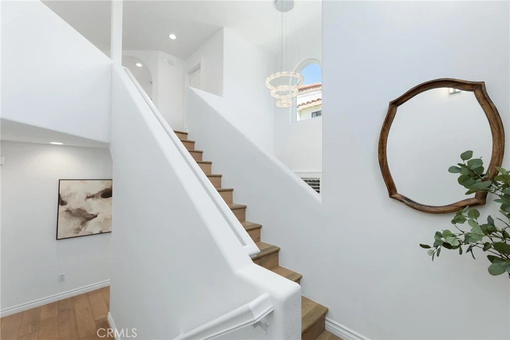 Set on a quiet tree-lined street <1 mile from the beach, with soaring double-height ceilings, expansive windows, and multiple private patios – this renovated 2700+ sq ft freestanding townhome offers the light, scale, and indoor/outdoor flow that defines the best of the Beach Cities lifestyle. The main living level is built for both entertaining and everyday ease, anchored by a dramatic vaulted living room with fireplace and seamless access to the private terrace. The living room opens to the kitchen, which offers a functional yet refined design including a large center island with breakfast bar seating and stainless steel appliances, including a Thor Kitchen six burner range and new Bosch dishwasher. Across from the kitchen and framed beneath the arch entryway, the dining room feels both elegant and inviting, complemented by a custom built-in buffet. Each end of the main floor features private living space: on one side is the primary suite, which serves as a true retreat, featuring vaulted ceilings and direct access to the large, private terrace. The ensuite bathroom is thoughtfully designed with a dual vanity, freestanding soaking tub, large glass shower, private toilet room, and a spacious walk-in closet. On the opposite side of the main floor, an additional front bedroom features a private terrace with view of the tree-lined street, and a powder room for guests. Up the spiral staircase is the loft level, where a flexible bonus living space offers versatility as a home office, creative studio, or additional lounge area. Attached to the loft is another private patio with a peek-a-boo view of the ocean and an uninterrupted breeze. On the lower floor, there’s additional flex space beneath double-height ceilings that opens to the front patio through sliding glass doors, ideal as a home gym, sitting area, or secondary office. Down the hall there are two bedrooms with large walk-in closets and abundant natural light, complemented by a full bathroom. Additional highlights include direct access to the attached two-car garage, a separate laundry room with extra storage and counter space, connected smart home for security and convenience, and emphasis on organic materials - including real wood floors, stone tile, and wood shutters throughout.