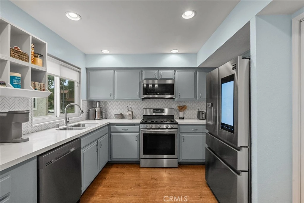 Beautifully Remodeled 3-bedroom + Bonus Room/Office offers the perfect blend of comfort and style. Step inside to a spacious living room featuring a cozy gas fireplace, 6 recessed LED smart lights that change colors, modern flooring, and abundant natural light from a sliding glass door leading to a private patio. The patio, ideal for outdoor enjoyment, boasts new fencing and is perfect for enjoying the California sunshine. The kitchen is a chef's dream with sleek quartz countertops with stylish herringbone tile backsplash accented with high end and matching Samsung stainless steel appliances. Open to the dining area, this space is perfect for hosting friends and family. A convenient indoor laundry area is also located on this level. You'll feel the true modernization with all new 5 panel Frosted Glass Bianco Noble Finished doors throughout the home. Upstairs, you'll find all three generously sized bedrooms, each with ceiling fans for added comfort. Primary bedroom with city views and en suite bathroom. Updated tiling in the shower and new vanity with led lighted mirror that defrosts. Guest bathroom features a barn door, LED mirror that defrosts and tiled shower with new vanity and faucet. Plus, enjoy the bonus room which is ideal for a home office or gym, equipped with its own AC unit for added convenience. Seller purchased and will provide a matching barn door for the primary bathroom but hasn't installed it. Enjoy the peace of mind that comes with living in a gated community with a private pool, while also being close to shopping, restaurants, Pierce College, the 101 Freeway, Kaiser, Westfield Mall, and parks. Be home for the holidays!