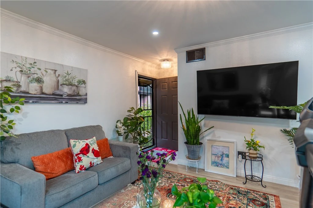 Welcome to this beautifully remodeled 2-bedroom, 1-bathroom townhome located in the desirable Birchwood Townhomes community in Reseda. Thoughtfully updated and move-in ready, this home offers a bright, open layout with modern finishes throughout. Step inside to newer wood-like flooring and elegant 3x16 Havana Wood Plank porcelain tile in the kitchen, entry, and laundry room. The upgraded kitchen features sleek quartz countertops, a Kohler Prolific undermount stainless steel sink complete with bamboo cutting board and adjustable drying racks—perfect for both everyday living and entertaining. The spacious indoor laundry room is conveniently located off the kitchen and enclosed with a stylish barn door, offering ample space for an oversized washer and dryer. Recently replaced interior doors and framing showcase modern white panel doors accented with brushed nickel hardware for a clean, contemporary look. Both bedrooms are generously sized, with designer touches including a tasteful ceiling fan in one bedroom and a Possini Euro light fixture in the second. The upgraded hall bathroom offers a spa-like feel, featuring a floating vanity with vessel sink, Kohler faucet, tiled shower walls, and a modern Possini Euro light fixture. The dining area opens to a private, spacious patio—ideal for outdoor entertaining or relaxing evenings. Enjoy the convenience of direct private access to a two-car attached garage. Birchwood Townhomes offers wonderful community amenities, including beautifully maintained common areas and two sparkling pools. This is the perfect home for first-time buyers, downsizers, or anyone seeking comfort, style, and convenience in a welcoming community.