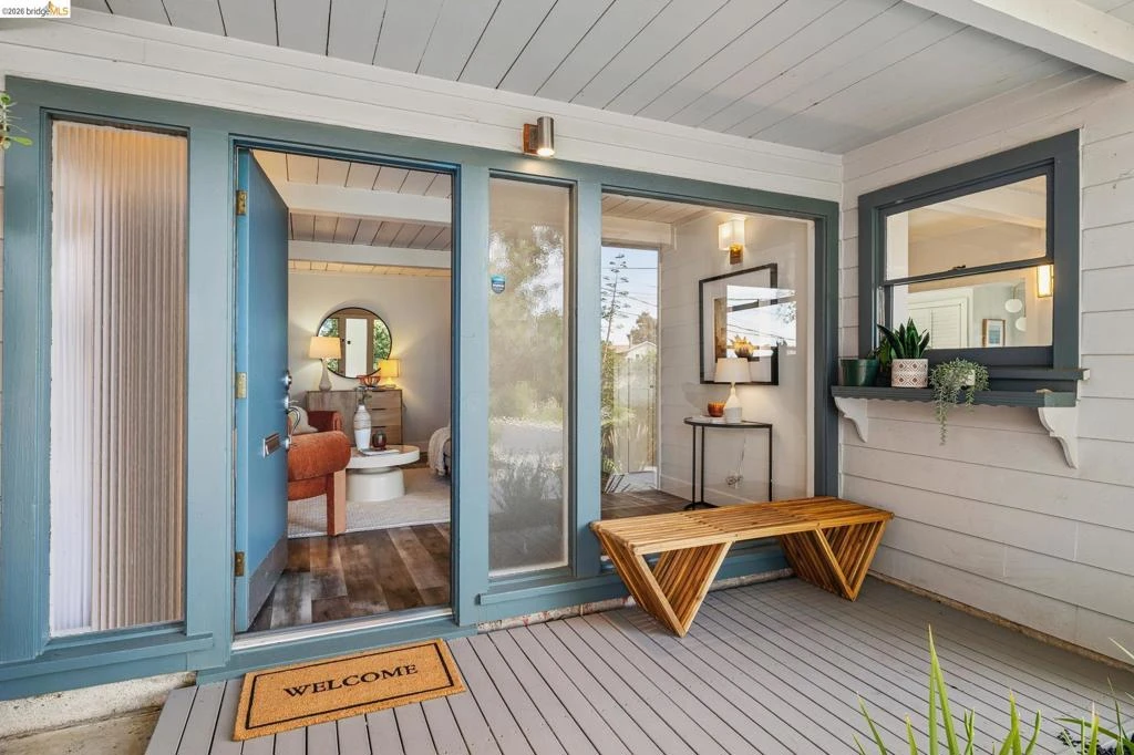 Located on a sunny East Richmond Heights parcel on the El Cerrito border, this charming, spacious, single level 2/1 mid-century offers an inviting layout, beautiful natural light, and a generous yard perfect for entertaining + everyday living. Level-in entry welcomes you into a bright + airy living room featuring a gas fireplace and a striking floor-to-ceiling window to the front deck, bringing in abundant natural light and creating a warm, inviting atmosphere. The spacious kitchen has updated appliances + flows seamlessly into the dining area, where French doors open directly to the level backyard, creating a perfect indoor-outdoor connection for dining al fresco, gardening, or relaxing. Both BRs are well proportioned and look out onto the lush gardens, just off the shared bathroom. A long driveway provides convenient parking as you pull up to the sunny, landscaped front yard with mature plants, flowers, and trees that add to the home’s curb appeal and privacy. Serene, private and quiet, this home combines comfort with easy living. Zoned for El Cerrito High School, it is conveniently located down the block from Mira Vista Elementary School, with a short drive to BART, El Cerrito and Kensington shopping, and the trails in Wildcat Canyon Regional Park.