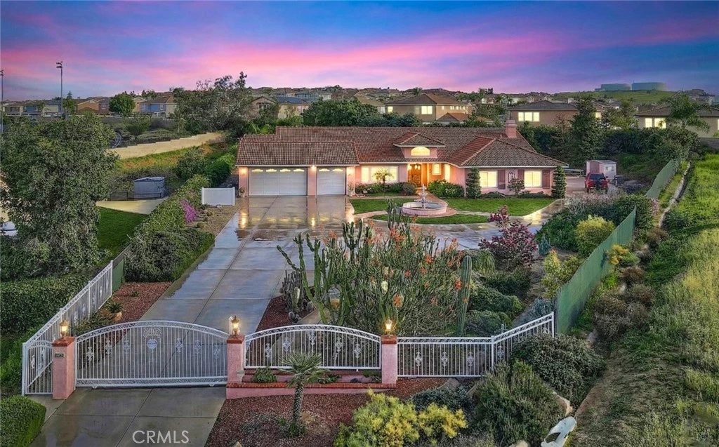 Prime location estate style home gated pride of ownership well maintained home pool rv parking above ground garden area citrus area fountain custom painted walls throughout the home sunset views lots of parking great school district close to shopping and freeways too much to list must see single level