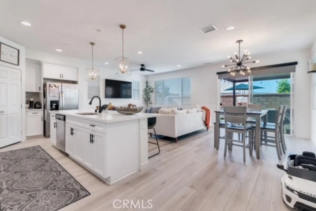 This 4 bedroom, 3 barth contemporary residence bost 2214 square feet of living space, built in 2022 in the Collett Crossings Community of Riverside. Floor plan is open to the living and dining area, perfect for entertaining and fun! The kitchen has Quarts Countertops, stainless steel electric range, dishwasher, and microwave and walk-in pantry. Vinyl plank flooring, open loft, ceiling fans with an up stairs laundry. The master suite has dressing area, large walk-in closet, soaking tub and separate shower. 2 car attached garage. Low maintenance back yard with aluminum patio cover with adjustable slats for additional shade. Custom steeping stones embedded in quality artificial turf. Close to dining, high school, parks, shopping and freeway.
