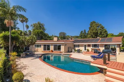 A Rare Opportunity- One Level Beauty in The Ranch, Rolling Hills Estates. This elegantly remodeled one level, serene and spacious home is located on a corner lot in a highly desirable gated community with 24-hour security - "The Ranch". Beautiful 4BR+den home boasts a harmonious blend of style, comfort, and modern living. Inviting living and dining rooms offer elegant entertaining spaces. The chef’s dream kitchen showcases a large center island and opens seamlessly to the family room and outdoor space. Large windows and sliding doors perfect the indoor-and-outdoor living style, providing abundant natural light and easy access to the spectacular backyard. This outdoor oasis is a true extension of the living space, featuring a sparkling pool, an outdoor kitchen with a built-in BBQ, dual burners, and a refrigerator. A cozy fireplace and comfortable seating areas with a charming fire pit complete the outdoor entertainment area. Lush vegetable and flower planters provide a Home & Garden ambiance. A convenient separate service gate offers direct access to this exceptional outdoor haven. Two primary suites provide comfort and privacy for multigenerational living. Two additional bedrooms share a Jack-and-Jill bathroom. A den offers the flexibility of being converted into a 5th BR or a home office. This remarkable home is also equipped with a solar system with Tesla power storage units, ensuring energy efficiency and backup electricity. Additional features include a 3-car garage with ample storage. Walk to Ridgecrest Middle School. Experience a tranquil lifestyle with unparalleled outdoor enjoyment in this magnificent home.