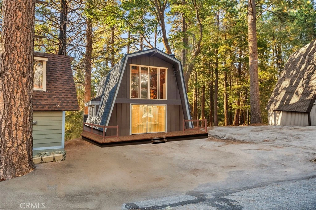 Tucked on a quiet street in Running Springs, this classic gambrel cabin pairs easy access with true mountain charm. A near-level approach and level parking make arrivals simple. Inside, the main level places the living room around a wood-burning fireplace, with high ceilings that open to a roomy loft. The floor plan is effortless: a bedroom and full bath on the entry level, plus an eat-in kitchen and laundry closet; the loft above flexes as a second bedroom, office, or lounge. A deck off the living area looks out to the pines—perfect for coffee at sunrise or starry evenings after the slopes. Minutes to village shops and dining, with quick connections to Hwy-18 for commuter ease, and close to Snow Valley, Lake Arrowhead, and miles of San Bernardino National Forest trails. A straightforward, well-kept retreat that lives comfortably today and welcomes your personal touch tomorrow.