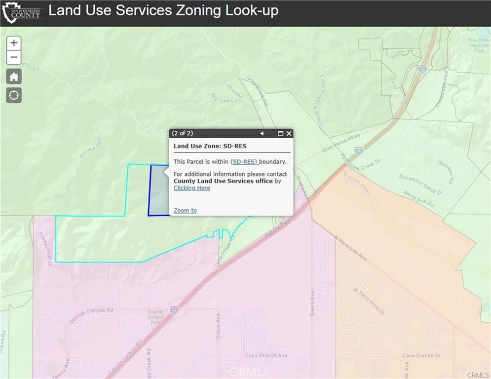 80 ac in the Foothills above North Fontana. County Zoned SD-RES (Special Development). The SD zoning allows for a combination of residential, commercial, industrial, agricultural, open space and recreation uses. The “RES” suffix indicates focus on residential Planned Development projects. Great Opportunity to acquire for the future and the theoretical residential development expansion into the hills. Landsea Homes has a new development at the base of the foothills called Narra Hills.