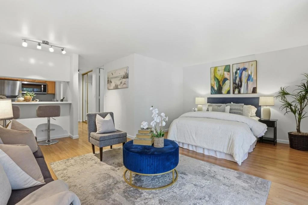 Studio condo located in the resort-style Shelter Creek community in San Bruno, surrounded by lush gardens and tranquil water features. The ground floor unit features granite kitchen countertops, newer appliances, engineered laminate flooring, a freshly painted interior, an updated bathroom, and a large walk-in closet. Enjoy a private patio with peaceful garden views, with the clubhouse conveniently located just outside the side door, providing quick access to the fitness center and community amenities. Shelter Creek offers two outdoor pools, an indoor pool, tennis courts, walking paths, and beautifully landscaped grounds. HOA dues are $515/month and include water, garbage, solar energy benefits, amenities, and one assigned outdoor parking space. Convenient mid-Peninsula location close to SFO, BART, Caltrain, shopping, dining, and major freeways.