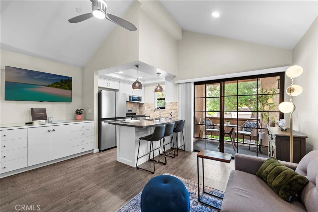 Discover coastal living in this beautifully updated 1-bedroom, 1-bath upper-level condo nestled in the sought-after Vista Pacifica community of Rancho San Clemente. This light and bright home features vaulted ceilings, new LED recessed lighting, ceiling fans, and all-new laminate wood flooring throughout. The stylish kitchen has been completely remodeled with quartz countertops, upgraded cabinetry, and brand-new stainless steel appliances—including a refrigerator and in-unit stackable washer and dryer. Enjoy your morning coffee on the private patio overlooking lush landscaping and serene waterfalls that wind through the community. Additional highlights include a detached one-car garage with ample storage and guest parking nearby. Community amenities include two sparkling pools, relaxing spas, and a clubhouse. Ideally located close to the beach, hiking trails, parks, golf, shopping, walking distance to Lifetime Fitness and easy freeway access. Perfect for first-time buyers, investors, or those looking to downsize and enjoy the Southern California lifestyle!