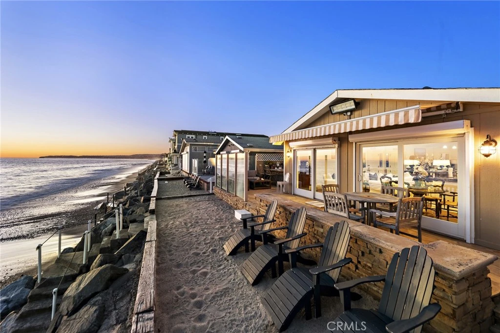 Embrace the art of refined beachfront living in this impeccably reimagined seaside retreat, nestled within San Clemente’s prestigious Capistrano Shores enclave. Poised directly on the sand, this single-level coastal sanctuary captures sweeping ocean panoramas, from Catalina Island to the Dana Point Headlands, with the iconic San Clemente Pier punctuating the horizon. Designed for both intimate relaxation and effortless entertaining, the three-bedroom, two-bath layout opens to a private, gated patio, where natural stone decking, an open-air fireplace, and a built-in BBQ island—complete with an under-counter beverage refrigerator—set the stage for al fresco gatherings. A coveted beachfront deck offers a tranquil escape for morning coffee or sunset cocktails, serenaded by the rhythmic tide. Spanning approximately 1,270 square feet, the residence embodies an air of understated elegance, accentuated by vaulted beamed ceilings, crisp white walls, and an abundance of natural light. The beach-view living room, flanked by dual sliding-glass doors, seamlessly transitions into a sophisticated dining area and a custom-designed kitchen featuring a central island, stone countertops with discreet appliance garages, white Shaker cabinetry with glass uppers, a farmhouse sink, and premium stainless-steel appliances. The primary suite serves as a serene retreat, highlighted by custom wainscoting, mirrored wardrobe doors, and an ensuite bath boasting a dual-sink vanity and a beautifully tiled shower. Modern conveniences include a discreetly stacked washer and dryer and a dedicated EV charging system. Seller installed a new roof in 2024. Situated moments from scenic beach trails, premier shopping, and an array of leisure amenities, Capistrano Shores presents an unparalleled opportunity to experience the best of coastal California—where effortless luxury meets the rhythmic allure of the ocean.