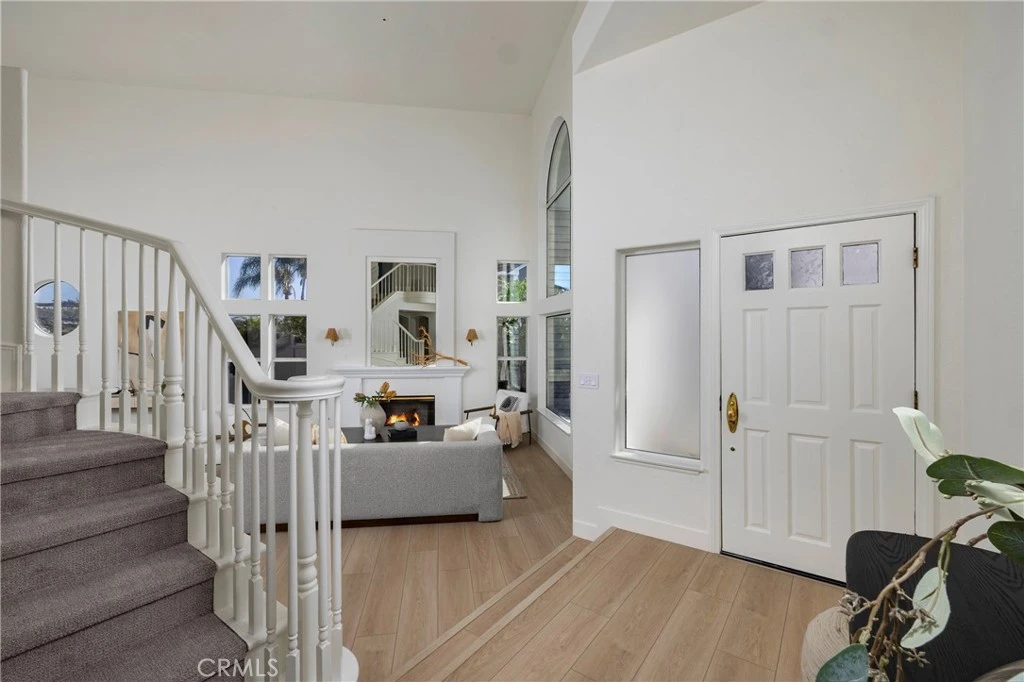 Spectacular home perched on a premium - flat lot, offering breathtaking canyon vista's, city lights and peek-a-boo ocean views set within the 24 hour- Guard gated Community of Highland Light Estates. Welcome home to this quiet cul-de-sac street and this newly upgraded residence with 4 bedrooms and 3 full sized bathrooms - including a main-level bedroom offering flexibility for guests or office use. Upon entry you will be in awe of the soaring ceilings, floor to ceiling windows and brand new premium wood style vinyl flooring throughout. The grand picture windows bring light and views through the formal living and dining spaces creating a Wow factor as you entertain next to the grand fireplace. The chefs kitchen has Quartz countertops, double ovens, 5 burner island cooktop stove, walk-in pantry and plenty of counter space and storage with the wrap around cabinetry - perfect for entertaining with the adjacent wet bar. The light filled family room has a beautiful fireplace and sliding doors to the incredible .26 acre backyard with multiple lounge and entertaining areas for sunset gatherings of any size or a quiet space to unwind and take in the ocean breezes. The full sports court is complete with a Basketball hoop and half court, next to a putting green with turf grass for a low maintenance environment. Leading up the circular staircase you will find the enormous primary suite with high beamed ceilings, a step-up retreat with a cozy fireplace and an oversized balcony with ocean and Canyon Vistas. The en-suite bath has dual walk-in closets with custom built-in organizers, dual sinks, vanity area, jetted tub and a separate walk-in shower. Across the hall you will find 2 large secondary bedrooms with high ceilings, peek-a-boo ocean views and an adjoining full sized bathroom. Imagine - the Ocean, fine dining and the playground of activities that San Clemente and Dana Point Harbor offers for your everyday life.