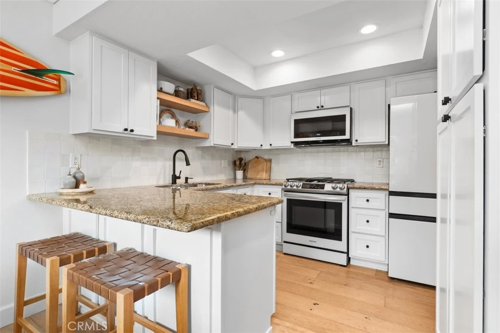 214 Via Robina #5 presents a stylishly renovated condo in the hills of San Clemente with inviting indoor spaces and relaxing views from the upgraded floating floor deck. Two bedrooms, two bathrooms and one car garage located on large cul-de-sac. The showpiece kitchen features modern Shaker cabinetry with CB2 matte black hardware, a handmade Zellige Moroccan tile backsplash with tight grout lines for sheer beauty, and granite countertops with a deep double sink. A suite of Samsung Bespoke matte black appliances, accented with white glass fronts, includes a five-burner gas range with oven, coordinating refrigerator, microwave and dishwasher. A raised ceiling with recessed lighting and an adjacent built-in banquette with custom cushions create a warm, functional dining space ideal for gatherings of up to 10–12. Both bathrooms have been elevated with designer mirrors, the primary featuring timeless marble flooring and the hall bathroom showcasing large-format porcelain floors and custom shelving. Throughout the home, brushed European oak engineered wood floors, finished with polyurethane for durability and beauty, add richness. Additional details include 4-inch crown molding, six-panel doors, and textured cut-pile carpet in the bedrooms. Each bedroom also offers a matte black ceiling fan for style and comfort. Other highlights include a central heater (installed 2016), dual-pane windows, custom built-in Shaker-style entertainment cabinetry in the living room, and a full-size stacked washer/dryer. For leasure enjoy the HOA common area garden for residents and common area patio with coastal and ocean views! This thoughtfully upgraded residence combines craftsmanship, comfort, and design — all within minutes of San Clemente’s beaches, shops, and restaurants.