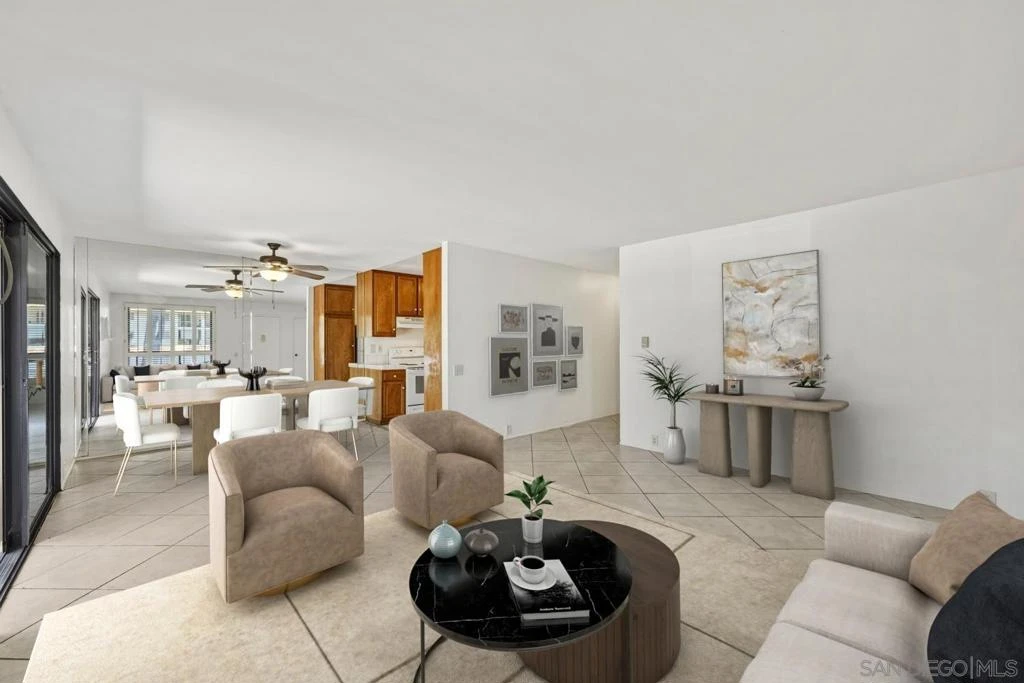This beautifully situated single-story end-unit offers the privacy and comfort of having no neighbors above or below, surrounded by lush trees and serene greenery. The thoughtfully designed two-bedroom layout features a spacious living area that opens to a large private patio—perfect for relaxing or entertaining—complete with a convenient storage room. Inside, the home offers an in-unit laundry room, a walk-in closet in the primary bedroom, and modern upgrades including a solar system for added efficiency and comfort. Two assigned parking spaces provide everyday convenience. Residents enjoy access to resort-style community amenities, including pools, spa, and tennis courts, all within a welcoming, dog-friendly neighborhood. Ideally located in San Diego, this home combines peaceful surroundings with easy access to everything the area has to offer.