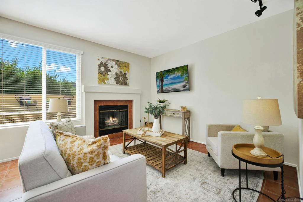 Welcome to this beautifully maintained townhome in the highly sought-after community of La Cresta in Sabre Springs. This desirable two-story floor plan features dual primary suites and is ideally situated within the complex, backing to serene canyon views with no neighbors behind you. The cozy living room with a gas fireplace flows seamlessly into the dining area, creating a warm and inviting space. The spacious kitchen offers additional space for a kitchen nook. Kitchen upgrades include rich Italian walnut cabinetry, Corian countertops, and stainless steel appliances — all included along with washer & dryer. Additional home improvements include fresh interior paint, a newer furnace, A/C, water heater, and double pane vinyl windows. The lower level features tile flooring, with carpeting on the staircase and throughout the upper level. Enjoy outdoor living in the large, private enclosed backyard, complete with a raised deck and a grass lawn with a sprinkler system — perfect for relaxing or entertaining. Convenient attached two car garage. Residents enjoy resort-style amenities, including two pools, hot tubs, and covered picnic areas. Location, location, location! Close to shopping, dining, and walking trails, with convenient freeway access. Situated within the highly acclaimed Poway Unified School District. Solar panels are allowed; needs to go through HOA process for approval.