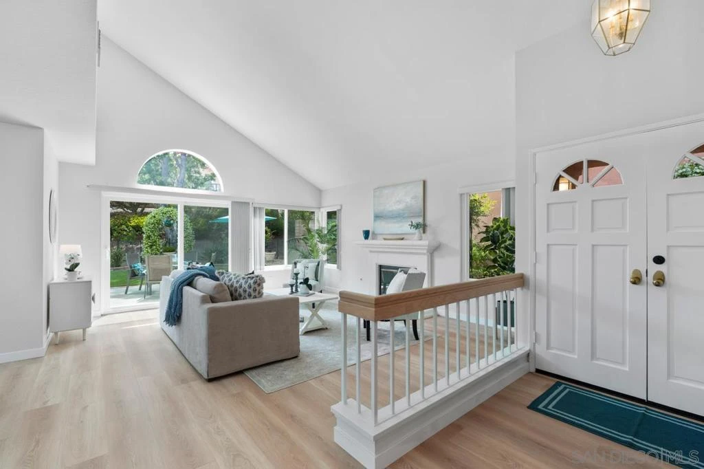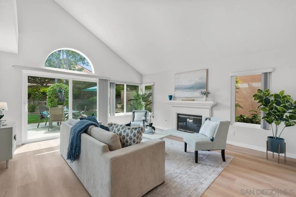 Step into this beautifully refreshed 3BR/2BA single-story home in the gated community of Bernardo Village, showcasing new luxury vinyl flooring and fresh paint for a bright, move-in ready feel. This spacious floor plan features a cozy living room with fireplace overlooking the beautifully maintained yard. Large skylights above the dining area fill the space with abundant natural light. The kitchen offers generous storage and an adjoining eat-in area. The primary suite boasts dual closets, soaring ceilings. The en-suite bath includes dual sinks, a soaking tub, and a separate shower. Additional highlights include vaulted ceilings, upgraded doors and windows, multiple skylights, and central air conditioning. Enjoy the low-maintenance backyard with patio space, artificial turf, and a manicured side yard—ideal for relaxing or entertaining. The two-car garage provides extensive storage with built-in cabinets, shelving, and a workbench. Refrigerator, washer, and dryer convey. Residents enjoy a nearby community pool and spa, plus access to the Bernardo Heights Community Center featuring tennis courts, swimming pools, fitness rooms, and a clubhouse. Conveniently located just minutes from the private Bernardo Heights Golf Course. Guest parking is also available within the community.