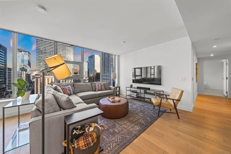 Welcome to Residence 1504 at Savina, Downtown San Diego’s premier luxury high-rise ideally located just steps from the waterfront and vibrant Little Italy. Positioned on the 15th floor, this northeast corner home enjoys sweeping city skyline views with a dynamic urban perspective. From this vantage point, you also capture a surprisingly impressive glimpse of the bay to the west, creating a beautiful balance of city energy and water views from nearly every room. Spanning approximately 1,444 sqft, this 2BR/2BA + den/nook residence features an open-concept great room, hardwood flooring, power Lutron shades (manual blackout shades in the primary bedroom), and generous storage. The spacious primary suite includes a large walk-in closet, while the kitchen and living areas flow seamlessly for comfortable daily living and entertaining. The home is presented in pristine, move-in-ready condition. Savina residents enjoy over 24,000 sqft of resort-style amenities including a lobby with concierge, business lounge, state-of-the-art fitness center with outdoor yoga terrace, spa with sauna and steam room, and a pool terrace with cabanas, fire features, and communal dining areas. Additional amenities include a social lounge with chef’s kitchen and billiards, pet retreat and dog washing station, bike tune-up station, EV charging, and secure resident access.
