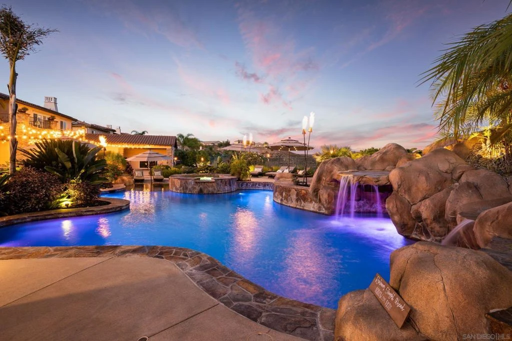 Luxurious home on one of the largest and private usable lots in Scripps Ranch with breathtaking panoramic views! Secluded south facing backyard is perfect for small, intimate or large gatherings of 200+ guests*The Hawaiian inspired tropical backyard features a resort size pool w/ beach entry, waterfall, slide, grotto, outdoor shower and cave bathroom!*Amazing 1000 sq ft cabana with kitchen, bar, 85" TV, pool table, shuffleboard & sitting area with fireplace*Numerous lounging areas, gas fire bowl, inground trampoline, gas Tiki torches and putting green area*Extensive, lush landscape design with 15 varieties of beautiful specimen palms*Gourmet kitchen with huge center island, two dishwashers, two refrigerators, pot filler, walk in pantry and butler panty*Large main suite with sitting area, dual walk in closets and opulent bath area with deck*All upstairs bedrooms en suite with walk in closets*Detached office & gym with beautiful views of the backyard*Media bonus room w/4K projector, 120" screen & surround sound* Former "San Diego Dream House Raffle" winning home! Don't miss your chance to enjoy resort living EVERY day!