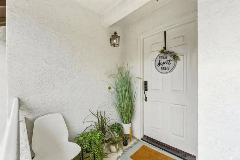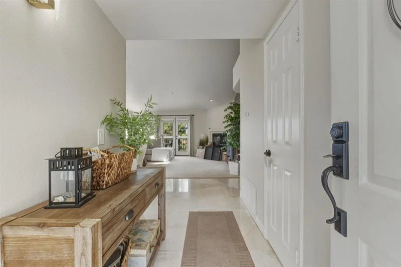 Experience penthouse living in the highly desirable Mira La Paz community, a resort-style enclave nestled in the heart of Bernardo Heights. This rare, top-level, single-story corner residence offers exceptional privacy with no common walls and sweeping views of the surrounding mountains and rolling hills. From the moment you step through the front door, you’re welcomed by a bright, open floor plan filled with natural light from expansive windows. The polished travertine entry leads into a spacious living room featuring a cozy gas fireplace and direct access to a private patio — perfect for relaxing or entertaining. Recently renovated, this stunning 3-bedroom home showcases fresh interior paint, plush carpet, beautiful marble and travertine flooring, updated lighting, and a striking new chandelier over the dining area. The upgraded galley-style kitchen is both stylish and functional, boasting granite countertops, refinished wood cabinetry, a tile backsplash, and Kenmore Elite appliances, including a double oven with gas cooktop. A charming breakfast nook provides the perfect spot to start your day. Storage is abundant, with generous hallway cabinetry and a stacked washer and dryer closet. The hall bathroom has been tastefully updated with a new vanity, light fixtures, shower door, and plumbing fixtures. Two guest bedrooms feature mirrored closet doors and inviting window seats. The spacious primary suite offers private access to a second patio, dual mirrored closets, and an upgraded en-suite bathroom complete with dual vanities, travertine flooring, new shower doors, and updated lighting and fixtures. Additional highlights include a two-car detached garage and access to outstanding community amenities. The HOA covers cable, water, trash, and exterior maintenance, and includes membership to the Bernardo Heights Community Association with access to Paseo Lucido Park, offering pools, tennis courts, a recreation room, and more. Mira La Paz residents also enjoy an on-site pool and fitness center. Located within the award-winning Poway Unified School District, this exceptional home combines comfort, style, and convenience in one of North County’s most sought-after communities. Welcome home.