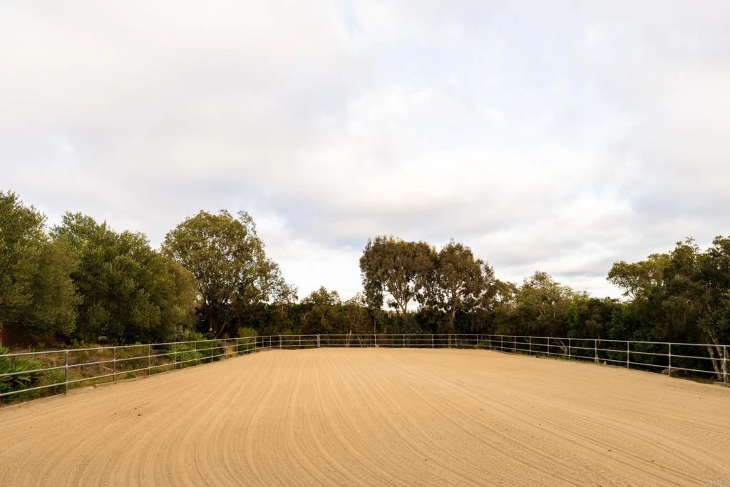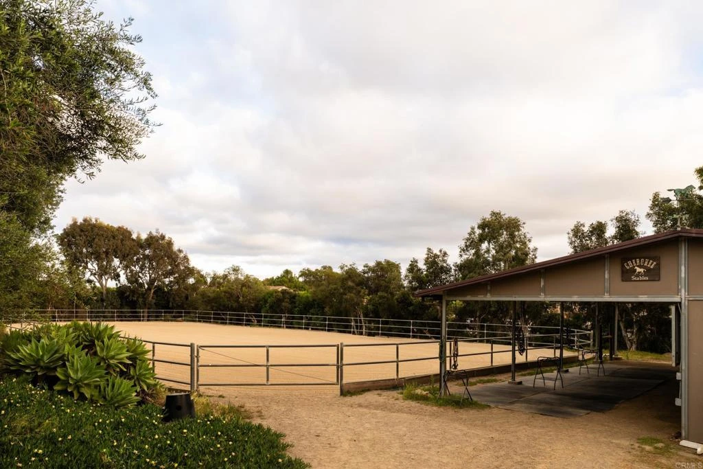 Located within a desirable enclave along Artesian Road, this Santa Fe-style ranch estate sits on a flat and usable 2.44-acre parcel, offering a balanced blend of timeless architecture, outdoor living, and functional equestrian amenities. The property is thoughtfully arranged with two separate gated entrances—one dedicated to the residence and the other to the equestrian facilities—allowing for both privacy and ease of operation. The 5-bedroom, 4-bathroom home features warm, inviting interiors, including a kitchen with a built-in breakfast nook designed for everyday living and casual gathering, flowing naturally into comfortable entertaining spaces. The landscape has been designed to complement and honor the architecture, creating a sense of cohesion and ease throughout the property. Outdoor living includes a pool and spa, BBQ area, and outdoor shower, with multiple areas to relax and unwind. A rooftop deck provides a unique vantage point, offering ocean views on clear days. Owned solar adds efficiency, and an attached ADU allows for flexibility for guests, staff, or extended family. Equestrian facilities are practical and well laid out, with a 4-stall barn supported by 10 corrals, tack rooms, wash racks, and cross ties. The property also includes an arena, round pen, and pasture, supporting a variety of riding disciplines and equestrian lifestyle needs. Direct access to miles of county-maintained horse trails, including effortless connection to the Lusardi Creek County Preserve, creates a seamless experience between the property and the surrounding landscape. Surrounded by open space and designed with a sense of harmony in mind, the property offers a grounded and authentic approach to ranch living—where architecture, land, and lifestyle come together in a quiet, understated way.