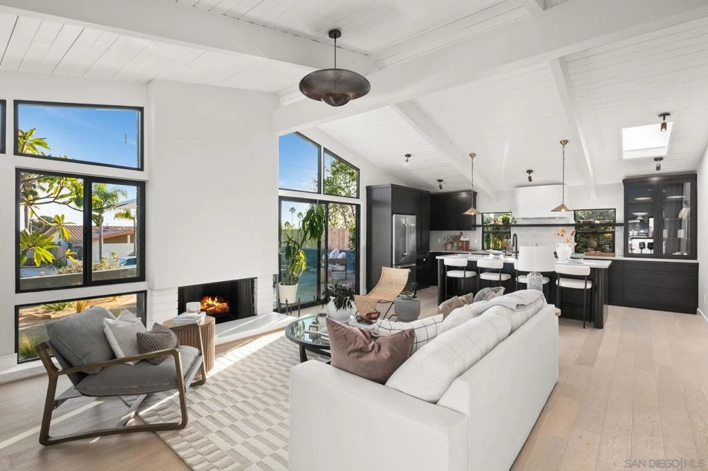 Nestled on a tranquil cul-de-sac in Pacifica—one of Pacific Beach’s most sought-after hillside neighborhoods—this architecturally significant, single-story William Krisel residence has been masterfully reimagined with a refined, modern sensibility. A dramatic living room welcomes you with soaring vaulted wood-plank ceilings, expansive new vinyl windows, and a striking fireplace that anchors the bright, open layout. New engineered hardwood flooring flows effortlessly throughout, guiding you to the front patio where panoramic bay and city vistas unfold—offering front-row enjoyment of evening SeaWorld fireworks and the sparkling skyline. The designer-curated kitchen impresses with vaulted beam ceilings, extensive custom cabinetry, premium stainless-steel appliances, quartzite countertops, a statement island, and artisan tilework, creating a culinary haven ideal for both casual gatherings and elevated entertaining. The tranquil primary retreat echoes the home's architectural style with lofty beamed ceilings and generous volume, complemented by an elegantly remodeled ensuite showcasing custom cabinetry, quartzite finishes, and a walk-in designer shower. Two additional bedrooms and a tastefully updated guest bath provide comfort and functionality for family or guests. Designed for effortless indoor-outdoor living, the newly landscaped grounds feature fresh plantings, lush ground cover, and sunny southern exposure in the backyard—offering a perfect canvas for a future terraced garden or outdoor sanctuary. Thoughtful improvements include a new asphalt-shingle roof layer, 200-amp electrical panel, upgraded ducting and thermostat, newer A/C, energy-efficient dual-pane windows and sliders, an added fourth bedroom/office and dining area, and a spacious two-car garage with abundant storage. Perfectly situated near Kate Sessions Park & Playground, Capehart Dog Park, top local schools, sought-after dining, convenient freeway access, and the vibrant coastal lifestyle that defines Pacific Beach, this exceptional turnkey residence blends iconic mid-century architecture with contemporary luxury and modern livability in one of San Diego’s most desirable neighborhoods.