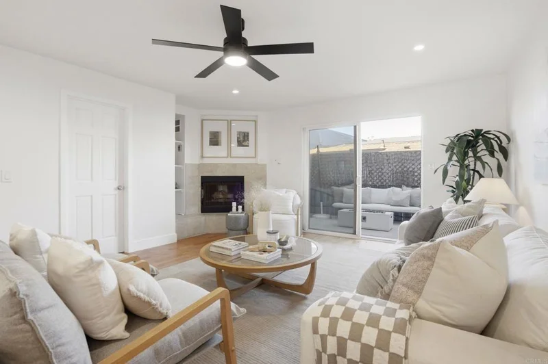 Wake up to salt air and the sound of waves just a block away. This beautifully reimagined coastal retreat sits in the beating heart of Ocean Beach — one of San Diego's most beloved and authentically eclectic beach communities — where the pier, the sand, and the vibrant energy of Newport Avenue are all part of your daily life. Step inside and an airy, light-filled living space welcomes you with warm hardwood floors flowing through an open-concept layout. The living room features a stone-surround fireplace and oversized sliding glass doors that open to a private patio (the only one in the building), blurring the line between indoor and outdoor living. The kitchen is a showstopper — a generous peninsula with seating for six beneath modern pendant lights, surrounded by white shaker cabinetry, quartz countertops, stainless steel appliances, and a glass tile backsplash. It's a space built for hosting, whether you're plating tacos after a sunset surf or pouring wine for a dinner party. Three serene bedrooms offer thoughtful retreats — the primary with palm-framed views, the second and third bathed in skylight. Both bathrooms feature marble-style countertops, warm wood vanities, matte black fixtures, and elegant tilework, including a walk-in glass shower and a separate tub-shower combo. But the real magic is the address. One block to the sand, steps to the OB Pier, surrounded by the farmers market, surf shops, beloved restaurants, and the kind of neighborhood character that can't be replicated. Ocean Beach isn't just a location — it's a lifestyle. This is your chance to own a piece of one of California's last true beach towns. Welcome home.