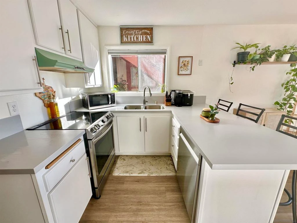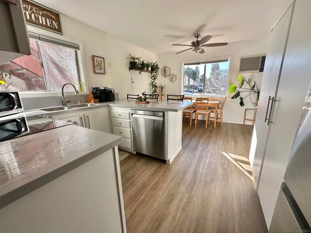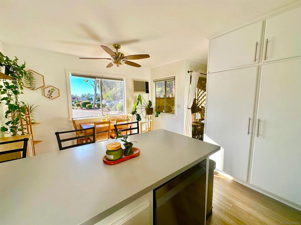 Welcome to this fully furnished first-floor corner condo designed for comfort, convenience, and easy living. Ideal for medical professionals, the home is just minutes from Sharp Grossmont Hospital, Alvarado Hospital Medical Center, and SDSU. This bright west-facing unit enjoys beautiful sunset light and features a screened-in porch for relaxing outdoor space. Inside, you will find high-end stainless steel Samsung appliances, a large built-in pantry, and an in-unit washer and dryer for everyday convenience. Both bedrooms include blackout curtains for restful sleep, and the second bedroom features a Murphy bed that converts from twin to king for flexible living. Accessibility is a standout feature with a wheelchair ramp, handicap parking next to the unit, and handrails in the bathroom and shower. Additional features include a Ring doorbell, security system, and assigned parking. The second bedroom also functions perfectly as a home office, complete with a computer monitor, printer, and shredder. The kitchen is fully stocked with cookware and essentials, and the bathroom includes starter toiletries and fresh towels for a seamless move-in. Small exercise equipment is also available for added convenience. Enjoy access to the community pool, hot tub, grills, and clubhouse while living in a quiet, centrally located neighborhood close to shopping, dining, and freeway access. Move-in ready and thoughtfully equipped for a comfortable mid-term stay.