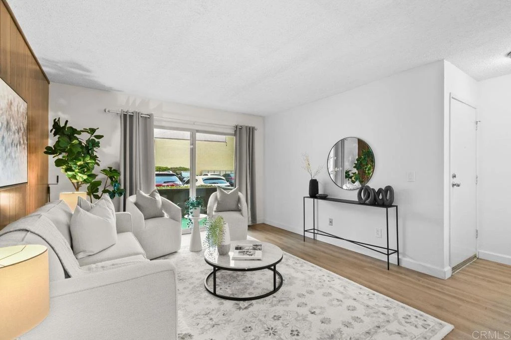 Location, location, location! Welcome to this charming, recently remodeled two bedroom VA approved condominium in the heart of Mission Valley. Thoughtfully upgraded throughout, this home features a modernized kitchen and bathroom, new window coverings, and stylish luxury vinyl plank flooring. The primary suite offers a spacious dressing area with it's own sink, direct access to the full bathroom, a linen closet, and a roomy walk-in closet. Step outside to the sun filled private patio complete with lush artificial turf, a secure private storage closet, and a brand new retractable sunshade. With the shade open, enjoy views of the surrounding neighborhood and car park--an ideal spot for a potted plant garden or relaxing outdoors. Located in the highly desirable Rancho Mission Villas, residents enjoy beautifully manicured grounds, tranquil water fountains, ample guest parking, two pool areas with Jacuzzis, picnic areas with furnishings, and BBQ's, a gym, tennis courts, secured restrooms, and a stunning clubhouse (see CC&Rs for details). This home is within walking distance of shopping, dining, the trolley station, a popular gym, and the exciting Snapdragon Stadium. Imagine hopping on the trolley just steps from your home to East County, Downtown, or North County. Prefer to drive? You'll appreciate the quick and easy access to Highways 8 and 15. Professional grade laundry rooms are conveniently located throughout the complex. Enjoy living in the vibrant Mission Valley community--homeownership at an affordable price with outstanding amenities. This just in: New building roofs in progress! Welcome home to Rancho Mission Villas.