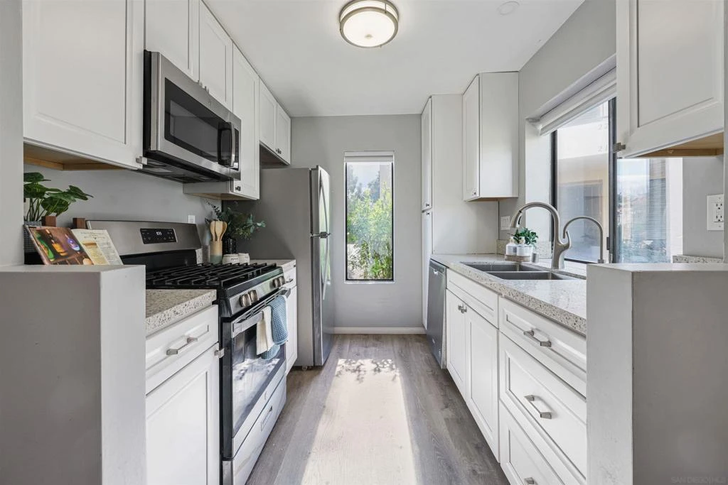 Beautifully Updated First-Floor Condo in Prime Walkable Location! Welcome to this thoughtfully updated 1st-floor condo offering comfort, style, and unbeatable convenience. This move-in ready home features Luxury Vinyl Plank flooring, newer interior paint, new lighting, mirrored closet doors, and a bright, modern feel throughout. The renovated kitchen and bathroom showcase cabinetry, quartz countertops, a gas range, dishwasher. Enjoy the convenience of stackable laundry located in your spacious private patio, with an additional community laundry room nearby if desired. Your covered parking space and the community pool are just steps from the unit entrance ,making everyday living effortless. Location is everything, and this condo truly delivers that! Step outside and enjoy a vibrant, walkable neighborhood where nearly everything you need is within 5–10 minutes: Morning coffee at Better Buzz or Starbucks Breakfast at IHOP Groceries at Vons or Target Pharmacy access at Walgreens or CVS EV charging nearby with Tesla and Electrify America stations Dining options galore: Habit Burger, Chick-fil-A, Chipotle, Little Sakana (all-you-can-eat sushi), Pista House (authentic Indian cuisine), or District 6 Gastropub Mira Mesa Library and neighborhood parks just a short stroll away Whether you're a first-time buyer, downsizer, or investor, this home offers the perfect combination of modern updates and unbeatable convenience in a highly desirable location. Everything you need is just steps from your front door.
