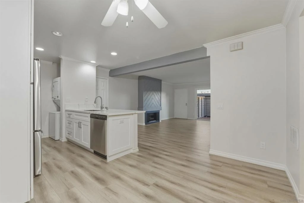 Beautifully renovated single-story, ground-floor 2 bed, 2 bath home in the heart of Serra Mesa. Almost completely renovated in July 2025, this spacious home features cozy fireplace, central AC, new luxury vinyl plank flooring, fresh paint throughout, and a stunning upgraded kitchen with soft-close cabinets, quartz countertops, pull-out spice rack, and a new faucet. The smart WiFi-enabled range offers voice control, a 6.3 cu. ft. oven, and rapid boil burner. Brand-new Energy Star dishwasher (ultra-quiet at 55 decibels) and large-capacity refrigerator included. Enjoy the convenience of in-unit stackable washer and dryer, a private patio, and two assigned parking spaces (one covered, one uncovered). Community amenities include two pools to enjoy! Stylish, turnkey, and perfectly located—this is 'the one' you’ve been waiting for. Don’t miss your chance to make it yours!