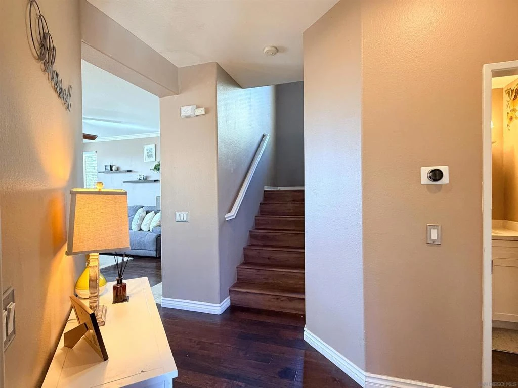 Nestled within the highly sought-after Tanglewood community of 4S Ranch, this rarely available END-UNIT residence offers exceptional privacy, a light-filled interior, and a wealth of thoughtful upgrades. The home features beautiful hardwood and luxury vinyl flooring, elegant crown molding, a new bathroom vanity, and tasteful light fixtures that create a modern ambiance throughout. The well-appointed kitchen showcases granite countertops, stainless steel appliances, a newer dishwasher, a high-performance range hood, and an ample pantry—perfectly suited for both everyday living and effortless entertaining. Designed for both comfort and efficiency, the home includes OWNED SOLAR PANELS and NEW HVAC SYSTEMS, providing energy savings and year-round climate control. The spacious and versatile floor plan offers 3 bedrooms, 2.5 bathrooms, and a generous loft, ideal for a home office, media room, or play space. The primary suite serves as a private retreat, where you can wake up to serene views and unwind in the evening while overlooking the distant horizon. Step outside to the backyard and take in BREATHTAKING SUNSET VIEWS, with PEEKABOO OCEAN VIEWS visible on clear coastal days. The home is located within the AWARD-WINNING Poway Unified School District and within walking distance of Del Norte High School, one of the region’s premier STEM-focused schools. Residents also enjoy convenient access to the community park just across the neighborhood, along with nearby shopping centers, restaurants, and the many amenities that make 4S Ranch one of San Diego’s most desirable communities.