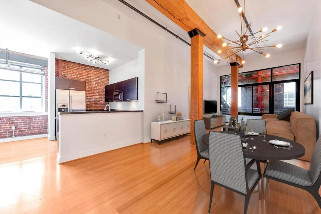 Prime City living in this spacious 2 BD 2 BA condo. Stunning, private & serene condo features exposed brick walls, timber beams & soaring ceilings. Bright, expansive open living/dining area w/ bamboo floors offers ample room for entertaining & looks out to a private stairway used only as an emergency exit. Adjacent chef's kitchen w/ ssl Bosch & Miele appls, sleek StudioBecker cabinets & granite counters. A separate space can be used as a den/office. Master BD w/ exposed brick wall, lg closet, & ensuite BA incl a shower over tub. large 2nd BD with built-in storage, walk-in closet, concrete floors & ensuite full BA w/ glass-enclosed shower. Both bathrooms were recently remodeled. Owner pays the HOA. In-unit w/d, 1-car park, & bike store in bldg. Conveniently located near vibrant SOMA, Mission Bay & South Beach
