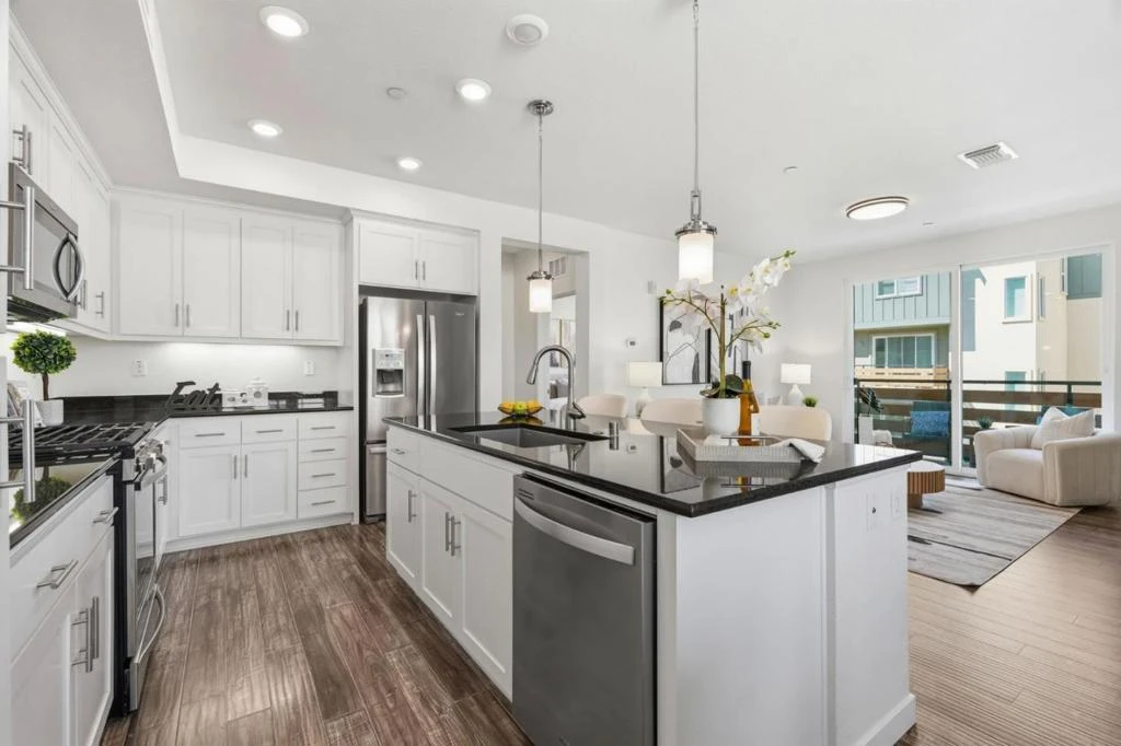 Welcome to one of the largest floor plans in the Onyx community in North San Jose. Built in 2017 by Pulte Homes. This bright end-unit townhouse-style condo features a spacious layout with a formal dining area and a living room with a balcony overlooking the lawn. The gourmet kitchen showcases a large island, stainless steel appliances, a gas cooktop, and custom white cabinetry. The master suite upstairs boasts a dual-sink vanity, a large shower, and a generous walk-in closet with a custom built-in organizer. The additional three bedrooms are perfect for guests, family, or a home office. Two car garage. Tankless water heater. Community amenities include a children's play area, BBQ area, and dog park, with nearby Newbury Park for outdoor recreation. Conveniently located near downtown San Jose and Japantown, with easy access to Costco, Ranch 99, H-Mart, BART, VTA, and freeways 101/680.
