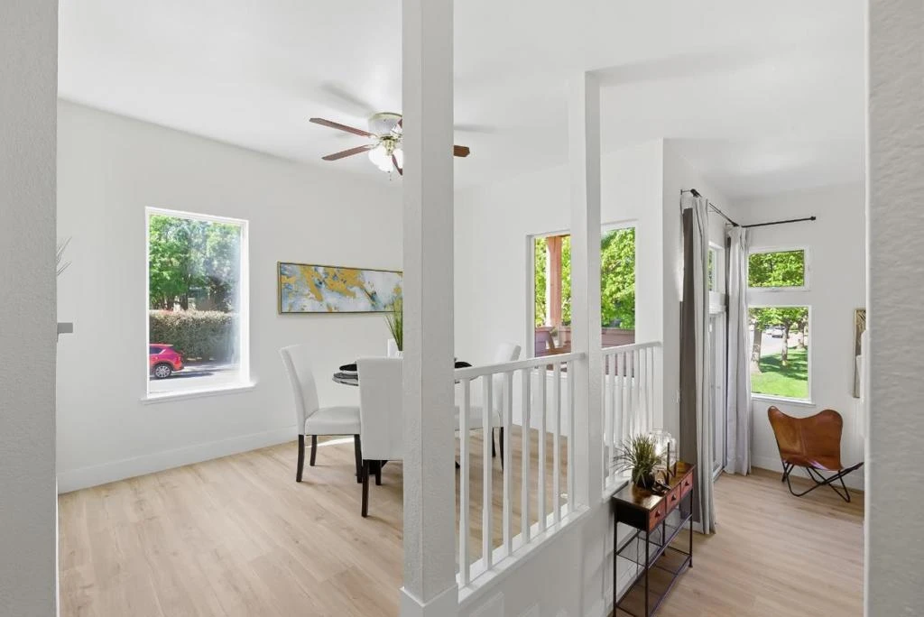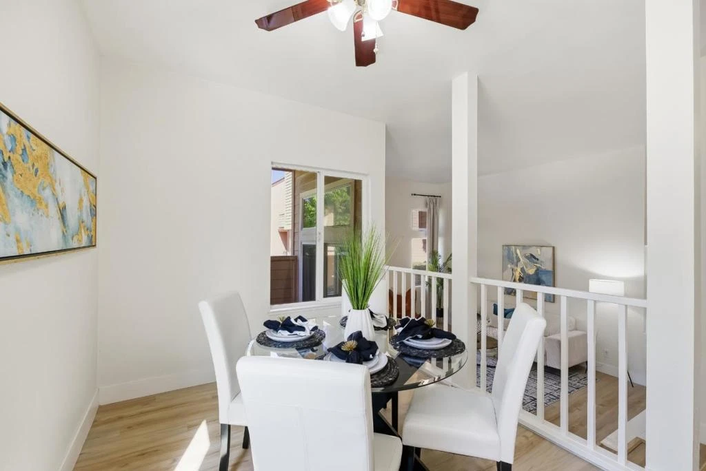Nestled in desirable Blossom Valley, this beautifully updated end-unit 2-bedroom, 2-bath condo offers 1,122 sq ft of stylish, move-in-ready living. Designed as an end-unit split-level layout, the residence features soaring ceilings, expansive windows, and a welcoming wood-burning fireplace that anchors the bright living room. Sleek luxury vinyl plank flooring flows through the main living spaces, while the bedrooms enjoy soft carpet for added comfort. The remodeled kitchen impresses with crisp white Shaker cabinets, quartz-style counters, stainless steel appliances, and a convenient breakfast bar that opens to the dining areaideal for entertaining. A spacious primary suite boasts generous closet space and an updated bath with contemporary finishes. Additional conveniences include in-unit laundry, 1-car garage, and dual-pane windows. Residents enjoy a sparkling pool, spa, lush greenbelts with walking paths, and a superb location with easy access to Highway 85, nearby shopping, dining, and everyday amenities.