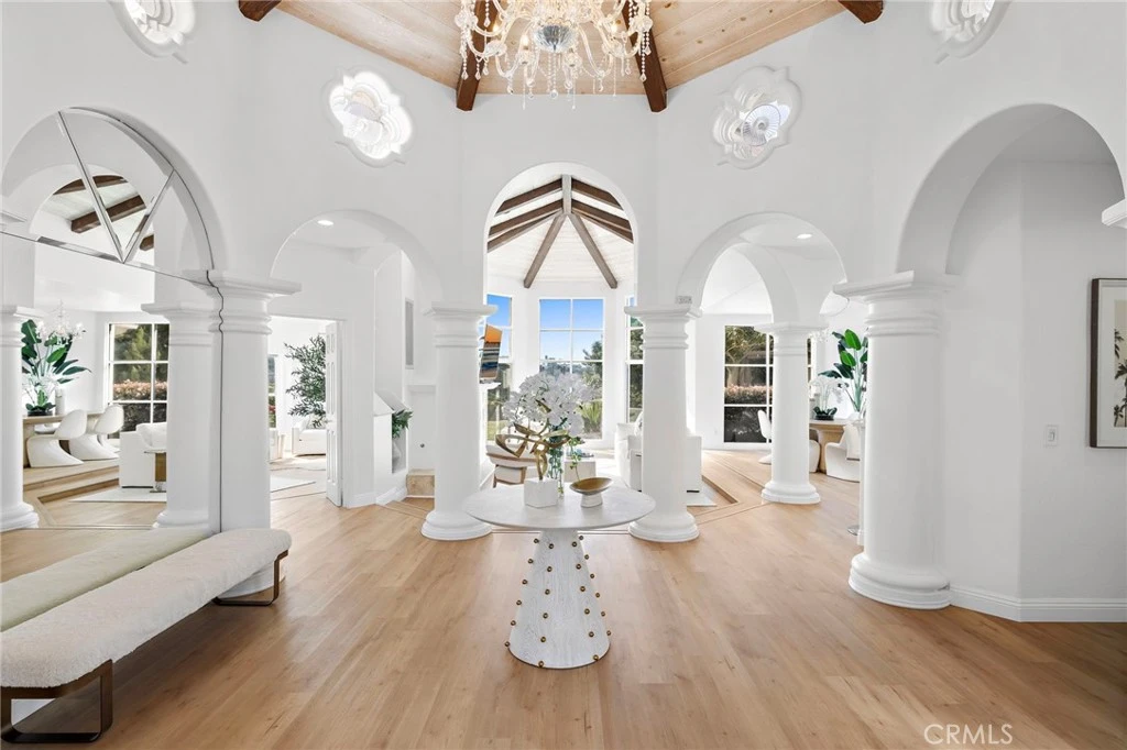 Beamed Ceilings, Breakfast Bar, Built In Features, Ceiling Fans, Cathedral Ceilings, High Ceilings, Quartz Counters, Recessed Lighting, Bar, Wired For Sound, Bedroom On Main Level, Entrance Foyer, Main Level Primary, Primary Suite, Walk In Closets