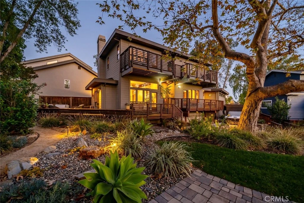 Tucked into a serene, private setting, this custom 3-bedroom, 3-bath residence sits on a 9,800 sq ft lot and offers a rare blend of privacy, thoughtful design, and seamless indoor–outdoor living. The backyard unfolds as a truly magical retreat, framed by mature trees, a stately sycamore, and tranquil natural surroundings, creating a peaceful, secluded feel while remaining moments from downtown San Luis Obispo. The home features a well-planned, functional layout highlighted by quality craftsmanship throughout. The kitchen is appointed with quartz countertops, custom mahogany cabinetry and trim, and stainless Bosch appliances, flowing effortlessly into the main living areas accented by cherry hardwood floors, recessed lighting, and a gas log fireplace. The primary suite serves as a relaxing retreat with an ensuite bath, walk-in closet, and direct access to the upper deck. Two additional bedrooms are thoughtfully positioned, with two of the three bedrooms offering direct access to exterior decks—enhancing natural light and connection to the outdoors. Multiple upper and lower decks extend the living space and provide ideal areas for entertaining or relaxing. Recent enhancements include professionally designed landscaping with DG pathways, pavers, a charming bridge over the stream, multiple seating areas, a water feature, exterior pathway lighting, fruit trees, and an above-ground spa with privacy fencing. Additional improvements include fresh interior paint, a new living room transom window, and electrical upgrades for the spa. Additional amenities include air conditioning, a dedicated laundry room, and an attached two-car garage. Ideally located in the Banana Belt neighborhood near French Hospital, downtown San Luis Obispo, and nearby hiking trails, this home offers a private retreat with exceptional convenience.
