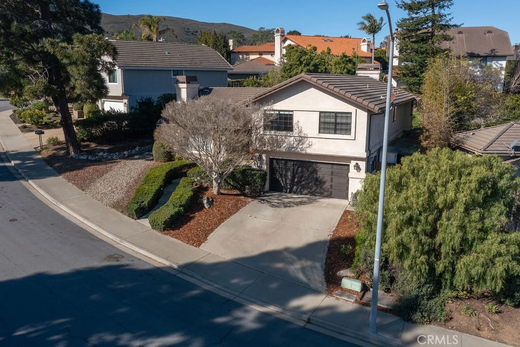 Spacious and lovely split-level home in the Laguna Hills area of SLO. The main entry level features a large foyer that leads to a formal living room on the left, complete with a fireplace and abundant natural light from large windows overlooking the park across the street. An open half staircase on the right leads up to the bedroom areas. Continuing into the home, you’ll find a generous formal dining room and a large, modern kitchen with a breakfast nook featuring built-in seating and French doors that open to the beautiful backyard. The kitchen includes a double oven, six-burner cooktop, new Sub-Zero refrigerator, and abundant counter space and cabinetry. Just a half flight of stairs down is the family room with a second large fireplace, along with an adjacent room ideal for an office or hobby space. This level also includes a half bath, laundry area, and access to the large two-car garage. The upper level features a spacious primary suite. The fourth bedroom is currently used as an office and is adjacent to the suite; minor modifications could easily convert it back into a true bedroom. Two additional bedrooms and a full bathroom complete the upstairs. The large lot features a 30-year-old redwood tree and several fruit trees, including apple, orange, peach, plum, and 2 avocados. Raised garden beds provide space for vegetables or other plantings. Completing the property is an owned solar power system that is just a few years old.