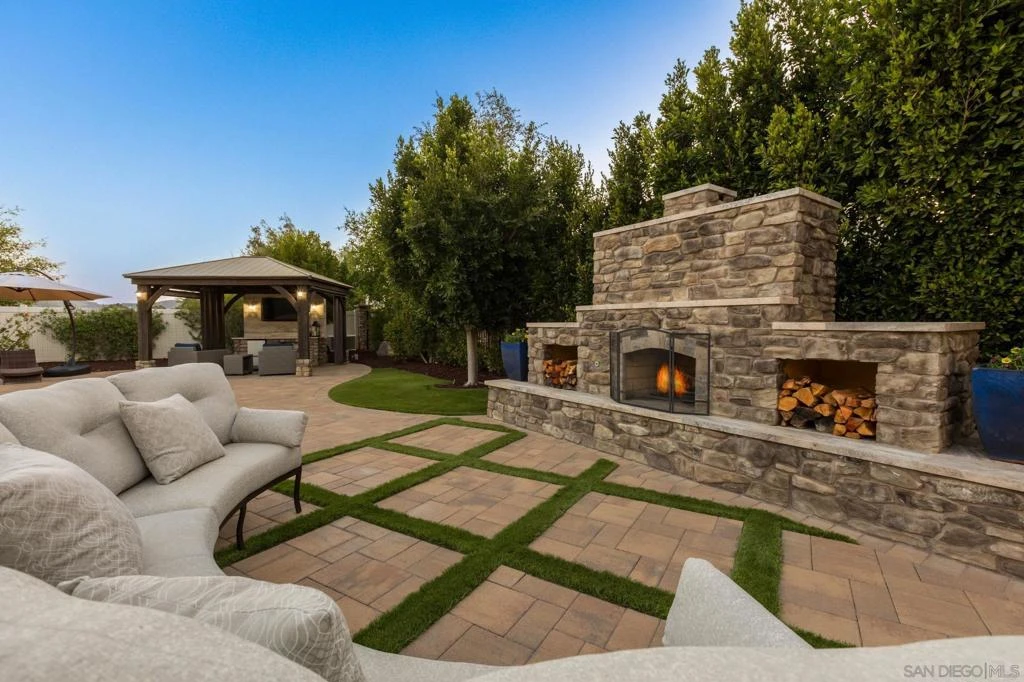 This exceptional corner-lot home, located at the end of a quiet cul-de-sac in a private enclave of only 19 residences, offers luxurious indoor-outdoor living in one of San Marcos’ most desirable neighborhoods. Set on an oversized lot with expansive mountain views, this stunning property showcases a seamless flow from the interior to a resort-style backyard through a multi-panel sliding glass door that opens to a custom California room—complete with ceiling beams, tiled accent wall, gas fireplace with custom wood mantle, 55” flat screen TV, ceiling fan, and remote-controlled blackout shade. Inside, you'll find designer finishes and thoughtful upgrades throughout. The flexible floorplan features a first-floor bedroom and full bath, ideal for guests or multigenerational living. The gourmet kitchen is a showstopper with quartz countertops, an oversized island, premium appliances, and floor-to-ceiling cabinetry. The luxurious primary suite includes two walk-in closets, a spa-inspired ensuite with a steam shower, and a custom-built barn door for privacy. Additional features include luxury vinyl plank flooring, Berber carpet in bedrooms and loft, plantation shutters, custom Roman shades, designer lighting and ceiling fans, a dedicated upstairs laundry room with washer and dryer, and Sherwin Williams paint throughout. This home is assigned to the highly-desired Twin Oaks Elementary, Woodland Park Middle School, and Mission Hills High School. Outdoor living is truly unparalleled, boasting a paver patio, custom built-in BBQ island with Lion stainless steel grill, sink, trash compartment, cooktop, and mini fridge. Entertain under the custom-built trellis with hanging lights or relax in the pre-built gazebo with stone-wrapped legs, granite countertop, ceiling fan, mini fridge, and a second 55” outdoor TV. The backyard is beautifully landscaped with low-maintenance synthetic turf (S-blade 50), mature privacy hedges, drip irrigation, and a custom fireplace that can burn gas or real wood. Additional upgrades include a whole-house fan, tankless water heater, custom window screens to prevent turf burn, a retractable front door screen, and a Ring doorbell camera. The 3-car garage offers ceiling-mounted and detached metal storage racks for ample storage. The assigned schools are the highly-desired Twin Oaks Elementary, Woodland Park Middle School, and Mission Hills High School. Ideally located near Palomar Community College, St. Augustine College of Health Sciences, Cal State San Marcos (CSUSM), and offering quick access to both Highway 78 and Interstate 15, this beautifully maintained home blends luxury, comfort, and convenience. With unmatched attention to detail, this home is truly one of a kind—schedule your tour today!