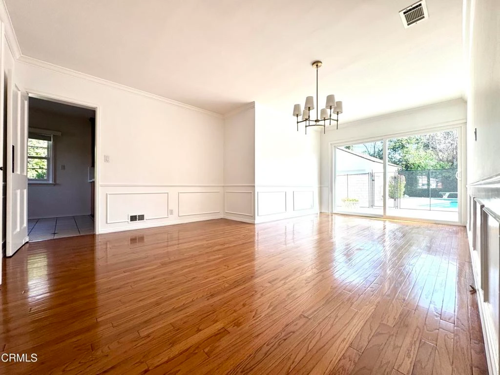 Conveniently located near Carver Elementary School and San Marino High School, this well-maintained residence sits on a quiet street. A covered front porch welcomes you into a home featuring gleaming wood flooring and fresh interior paint. The living room, anchored with a brick fireplace with a classic mantel is filled with natural light from a large bay window. Adjacent to the living area, the formal dining room showcases wainscoting and an elegant chandelier, with views of the backyard pool through a new sliding glass door.The galley kitchen, just off the dining room, offers newer quartz countertops, an updated sink & faucet, and ample cabinetry, along with a breakfast nook enhanced by a newer light fixture. Across from the kitchen is a laundry room with access to a three-quarter bath and a side door leading to the yard and driveway.The bedroom wing includes a primary suite with dual closets and a remodeled bath featuring a double vanity, soaking tub, and separate tiled shower with a frameless shower door. The second bedroom has view of the front yard. The generously sized third bedroom with a ceiling fan/light and sliding door to the back yard offers flexibility in its use. Additional features include central HVAC, a gated backyard with a mesh pool enclosure, and a two-car garage with an automatic opener. Gardening and pool service are included in the lease.