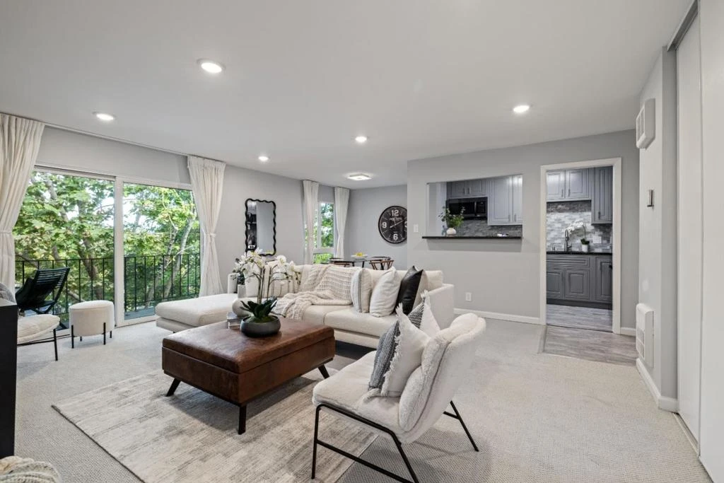 This stunningly updated top-floor unit is brimming with sophisticated detail and upgrades galore. The home's interior is awash with natural sunlight, complemented by contemporary recessed lighting that ensures a perfect ambiance for evening activity. The spacious living and formal dining areas, adorned with elegant floor-to-ceiling draperies, exude an air of luxury, while the remodeled kitchen, equipped with newer appliances, cabinetry, and sleek countertops, is a culinary enthusiast's dream space. Completing this exceptional unit is a recently updated, spa-like bathroom, and a generously sized bedroom featuring a custom-built closet system, as well as a spacious balcony area. Enjoy all that Woodlake has to offer, including, several gyms, pools, spas, tennis courts, putting greens and serene grounds with walking paths and lakes, as well as prime proximity to shops, restaurant and access to highways and transportation.